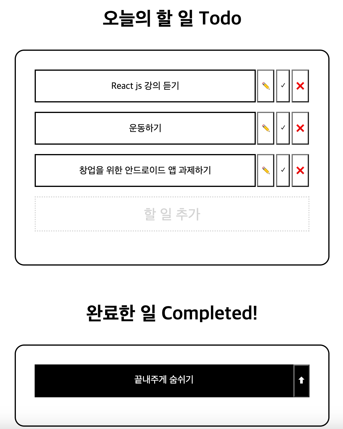 <div class="todo-item"><span class="todo-readonly">기존에 입력되어져 있었던 일</span><button>✏️</button><button>✓</button><button>❌</button></div>