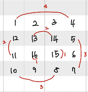 달팽이 같은 표는 n=4를 기준으로 1~16의 수들을 나열해 놓은 것이다.
