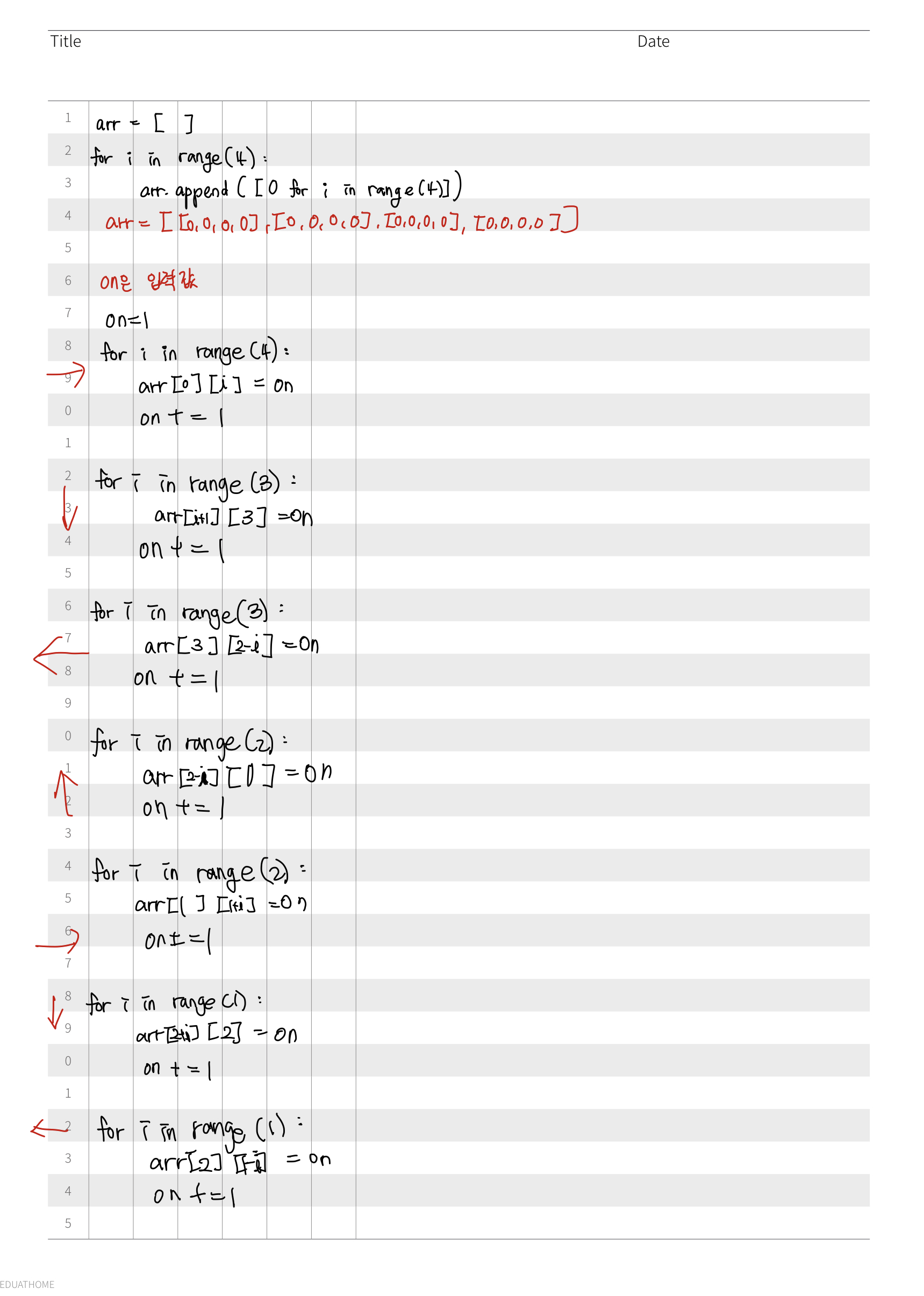 arr = [[1,2,3,4], [0, 0, 0, 0], [0, 0, 0, 0], [0, 0, 0, 0]] 로 만들어주었다.