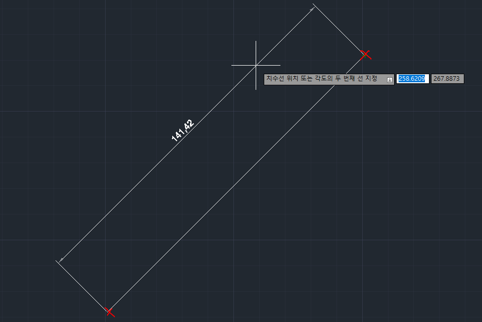 이렇게 두점을 찍어주면 사선으로 이렇게 치수가 기입된다.