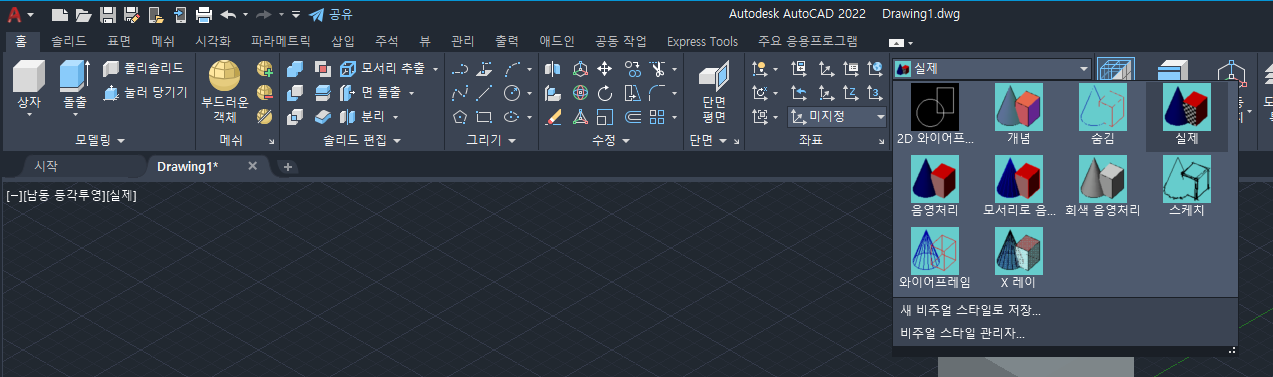 기본 설정값은 [실제]인데 [2D 와이어프레임]으로 바꾸면