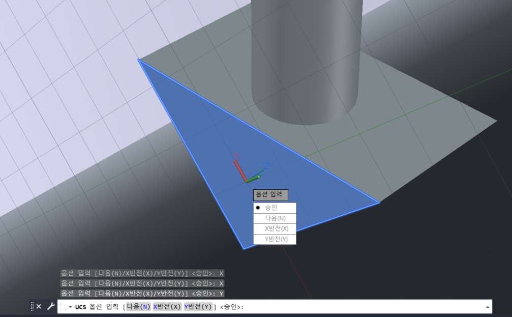 동적 UCS를 키면 UCS를 굳이 바꿔주지 않아도 잠시동안 UCS의 XY평면을 3D 객체의 면에 임시로 정렬한다.