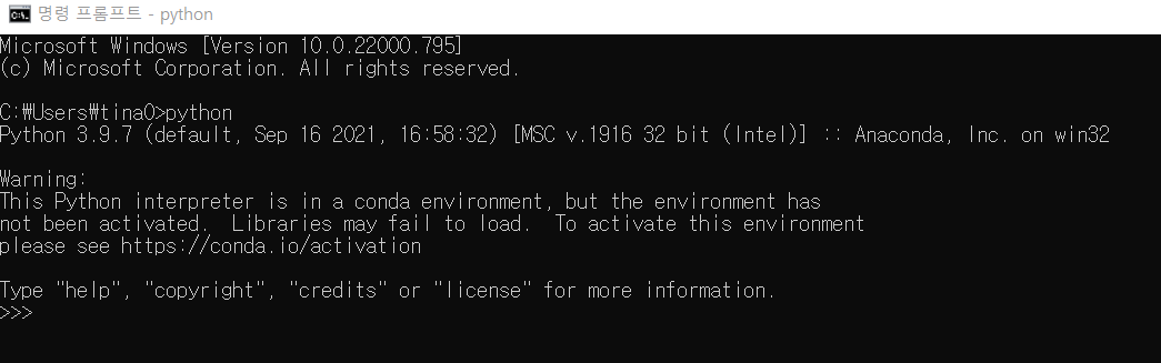 Python 3.9.7 (default, Sep 16 2021, 16:58:32) [MSC v.1916 32 bit (Intel)] :: Anaconda, Inc. on win32