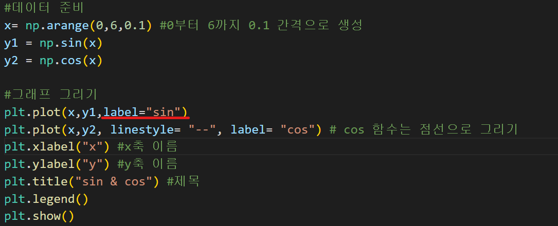 numpy의 arange(주의하자. arrange 아니다. r 한 개다.) 메소드를 통해 [0 0.1 0.2 ... 5.8 5.9] 라는 데이터를 생성하여 변수 x에 할당한다.