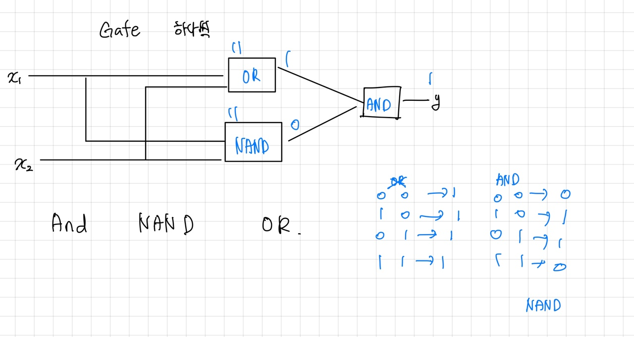 x1, x2가 NAND와 OR 게이트의 입력이 되고, NAND와 OR의 출력이 AND 게이트의 입력으로 이어지면 XOR 게이트의 구현이 가능해진다.