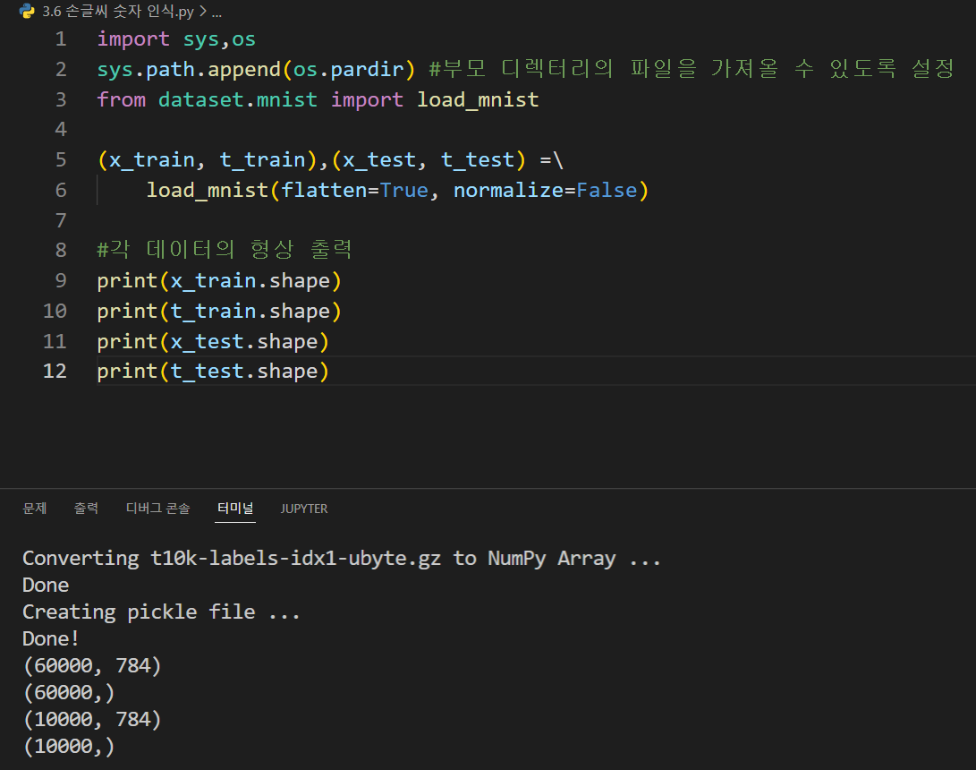 먼저 부모 디렉터리의 파일을 가져올 수 있도록 설정하고 dataset/mnist.py의 load_mnist 함수를 임포트했다.