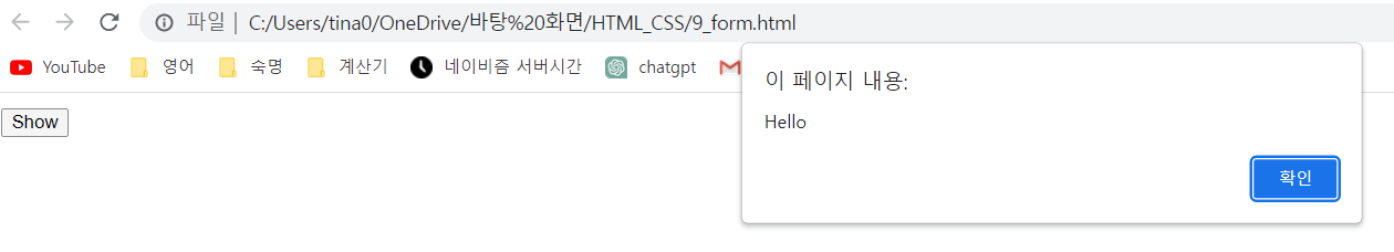 이렇게 Hello라는 자바스크립트 메시지를 포함한 창이 뜬다.